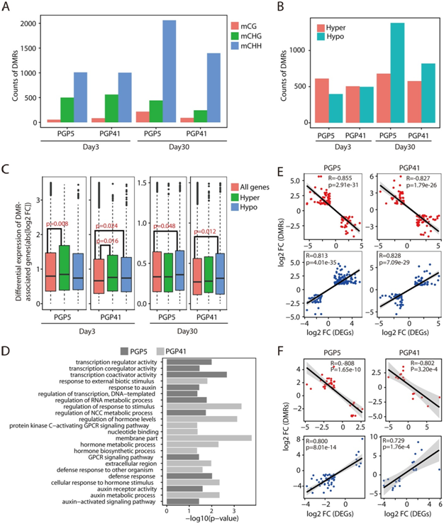 为了检测接种是否影响根中的DNA甲基化,进行了DNA甲基化的WGBS分析。每个样品中共鉴定出1400-1900万个甲基化胞嘧啶(mCs)。与CG (9-20倍)和CHG (2-6倍)背景相比,在CHH背景中鉴定出多个差异甲基化区域(DMRs) (图 5A);因此,只关注CHH背景下的DMRs。这些结果表明,在植物-微生物互作过程中,某些区域的DNA甲基化变化从起始阶段一直维持到后期阶段。在PGP5-Day 3中,高甲基化的DMRs占主导地位,而在PGP41-Day 3中发现了几乎等量的低甲基化和高甲基化的DMRs (图 5B)。然而,在第30天,低甲基化的DMRs在PGP5和PGP41样品(图 5B)中占主导地位。相应地,在PGP5-Day 3中,高甲基化(优势型) DMRs与所有基因(P < 0.01; 图 5C)相比显示出更高的差异转录丰度水平,而低甲基化DMRs与所有基因相比显示出相似的差异转录丰度水平(图 5C)。PGP5-Day 30 (P < 0.05)和PGP41-Day 30 (P < 0.05)的优势型DMRs也存在显著差异,而非优势型则表现出相似的水平(图 5C)。对于PGP41 - Day 3,在未检测到显性DMR类型的情况下,低甲基化和高甲基化DMR均表现出转录本丰度差异(P < 0.05, 图 5C)。优势DMR类型与转录本丰度之间的关系表明,接种诱导的DNA甲基化修饰可能参与基因表达的调控。