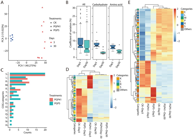 为了明确根际微生物组之间的功能差异,又进行了宏基因组分析。选取第3天和第30天的样本分别代表早期和晚期。在功能图谱的主成分分析(PCA)中,第3天样品在第一坐标轴上与第30天样品分离,PGP5和PGP41样品在第二坐标轴上与CK在第3天分离(图 3A)。然而,在第30天时,PGP5和PGP41样品与CK之间没有检测到分离(图 3A)。所有注释到KEGG类别的基因在第3天显示出比第30天更高的变异(以所有样本的变异系数来衡量),此外,在碳水化合物或氨基酸代谢类别中均存在显著差异(图 3B)。对于第3天的样品,在PGP5-CK和PGP41-CK中分别鉴定出55和77个具有显著差异丰度的COGs (图 3C-E)。然而,这些COGs在第30天的样品间表现出相似的丰度(图 3D, E)。此外,第30天,在PGP5-CK和PGP41-CK的比较中没有检测到丰度有显著差异的COG或KEGG类别。这些结果表明,接种后引起的根际微生物组功能水平的变化仅限于早期阶段。