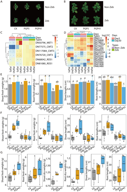 为了研究DNA甲基化在接种诱导的P. americana生长促进中的作用,用DNA甲基化抑制剂Zeb处理P. americana幼苗(图 6A, B)。处理后,分别接种经Zeb处理和未经Zeb处理的P. americana,检测接种诱导的促生长相关基因(图 6C, D)的表达。在没有Zeb处理的情况下,参与维持DNA甲基化的基因在接种根和未接种根的早期表现出显著不同的表达模式,但在后期中没有表现出显著差异(图 6C)。然而,在Zeb处理下,这些基因在Zeb处理的根中的基因表达比非Zeb处理的植株发生了错误的调控,表明Zeb处理破坏了Zeb处理植株中接种诱导的DNA甲基化模式(图 6C)。为了进一步验证Zeb诱导的DNA甲基化的破坏对接种诱导的生长促进相关基因表达的影响,从重叠的DEGs和DMRs中随机选择了15个基因进行了表达分析(图 6D)。正如预期那样,在这些基因中,与未被Zeb处理的植株相比,在Zeb处理的根中检测到了基因表达的错误调控。这些结果表明,Zeb处理可以通过改变DNA甲基化模式来破坏接种诱导的基因表达模式。与此一致,在接种处理下,与CK样品相比,未接种Zeb处理的P. americana (PGP5和PGP41)在第30天根和茎的生物量显著增加(图 6F),但在第3天没有显著变化(图 6E),表明在没有Zeb处理的情况下,接种诱导了植物的生长。然而,在第30天,Zeb +接种处理(Zeb-PGP5和Zeb-PGP41)和仅接种Zeb处理(Zeb-CK)的生物量没有显著差异(图 6F)。此外,Zeb处理的对照样品(Zeb-CK)和未处理的CK样品在第30天的生物量没有差异。这些结果表明,Zeb处理极大地削弱了菌剂对植物生长的促进作用。这些结果表明,接种诱导的P. americana的生长促进至少部分是由DNA甲基化的变化介导的。此外,还在接种后60天检测到接种诱导的P. americana生长有促进效果,这表明接种诱导的早期DNA甲基化改变在接种诱导的植物生长促进中具有长期效应(图 6G)。