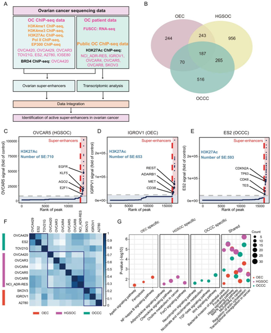 (A) 用于识别 OC 中异常激活的 SE 的分析策略的流程图。(B) 维恩图显示了每个 OC 亚型中 SE 的数量。 (C-E) OVCAR5中SE的数量、igrpv1、ES2细胞和相邻代表性基因的表示。(F) 矩阵显示了在不同细胞类型中检测到的 SE 的成对相似性。(G) 三种 OC 亚型中 SE 邻近基因富集的特定和共享的 KEGG 信号通路。