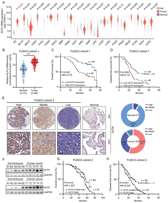 (A) TCGA 数据集中不同正常和肿瘤样本中KLF5的 mRNA 水平。 (B) FUSCC 队列 1 中正常和 OC 样本中KLF5的 mRNA 水平。(C-D) FUSCC 队列 1 中总生存和无病生存的 Kaplan-Meier 曲线。(E) FUSCC 队列 2 的 74 个正常组织和 165 个 OC 组织中KLF5的代表性免疫染色图像。(F) 正常组织和 OC 组织中KLF5蛋白水平的免疫印迹。 (G-H) 用KLF5蛋白水平分层的FUSCC队列2的总生存期和无病生存期的Kaplan-Meier曲线。