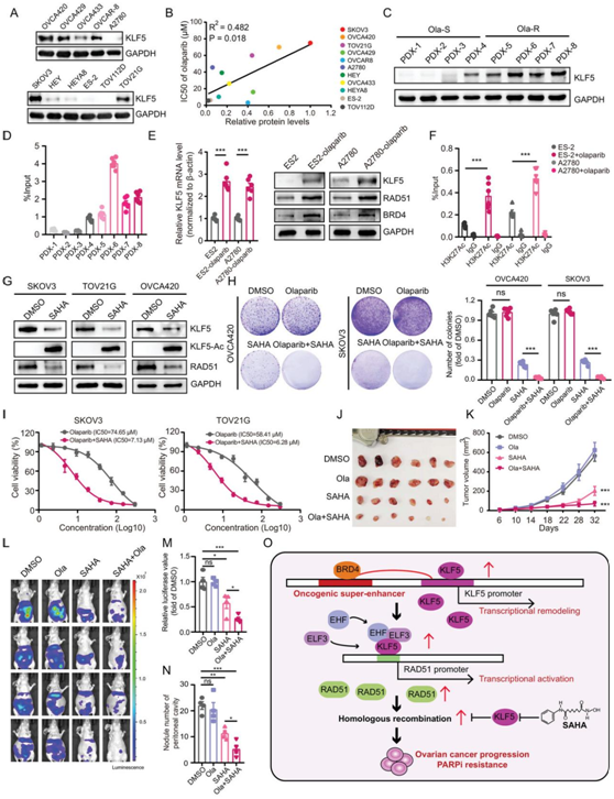 (A) 11 种 OC 细胞系中KLF5蛋白水平的免疫印迹。 (B) OC细胞系中KLF5蛋白水平与olaparibIC50值之间的相关性。 (C) OC olaparib敏感 (Ola-S) 或耐药 (Ola-R) PDX 样本中KLF5蛋白水平的免疫印迹。(D) 通过 H3K27Ac 信号的 ChIP-qPCR 测定olaparib敏感或耐药的 OC PDX 样品中KLF5超级增强子 2 的活性。(E) ES2、A2780 和olaparib处理的 ES2 和 A2780 细胞中的KLF5 mRNA 水平(左)和KLF5、RAD51、BRD4蛋白水平(右)。 (F) KLF5超级增强子2的活性通过 H3K27Ac 信号的 ChIP-qPCR 测定 ES2、A2780 和olaparib处理的 ES2 和 A2780 细胞中的 H3K27Ac 信号。 (G) 用 DMSO 或 SAHA (1µm)处理的 SKOV3、TOV21G 和 OVCA420 细胞中KLF5和RAD51蛋白水平的免疫印迹。(H) 克隆形成实验结果。(I) olaparib或olaparib联合SAHA处理SKOV3和TOV21G细胞的IC50值。(J-K) 异种移植物肿瘤和肿瘤体积。 (L-N) 荧光素酶图像、荧光素酶值、腹腔结节数显示在BALB/ c裸鼠中,DMSO、olaparib、SAHA、olaparib联合SAHA处理TOV21G细胞的腹腔肿瘤转移。(O) SE驱动KLF5的示意图。
