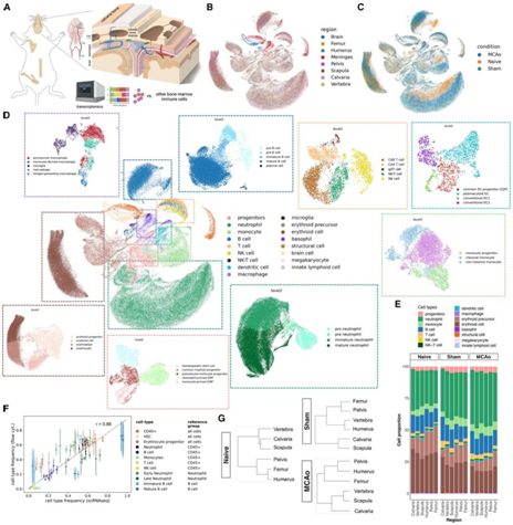 (A) 骨骼、硬脑膜和大脑的单细胞 RNA 测序的实验设计,以及中风大脑中动脉闭塞 (MCAo) 模型的示意图。(B–D) scRNA-seq 的均匀流形近似和投影 (UMAP) 可视化。(E) 粗细胞类型的相对比例。(F) scRNA-seq 中细胞类型的相对比例与使用 15 色面板通过流式细胞术测量的独立动物之间的相关性。(G) 未手术、假手术和 MCAo 条件的树状图。