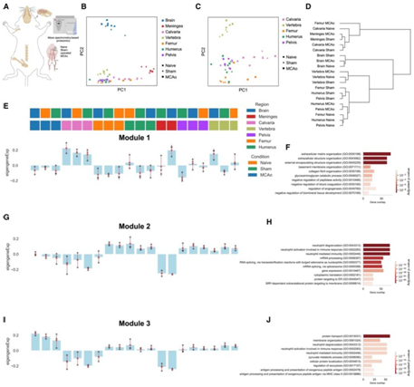 使用加权相关网络分析(WGCNA),他们确定了三个具有颅盖特异性差异的模块。模块 1[主要与细胞外基质 (ECM) 组织相关]在所有三种情况下的颅盖样本以及脑膜 MCAo 和椎骨 MCAo 样本中均有所增加(图3E-F)。模块 2(主要涉及中性粒细胞脱颗粒和免疫以及 mRNA 加工)显示大脑、颅骨和脑膜中的表达减少(图 3G-H)。模块3在颅盖和脑膜中也下调(图3I),该模块与蛋白质运输、中性粒细胞脱颗粒和免疫通路相关(图3J)。