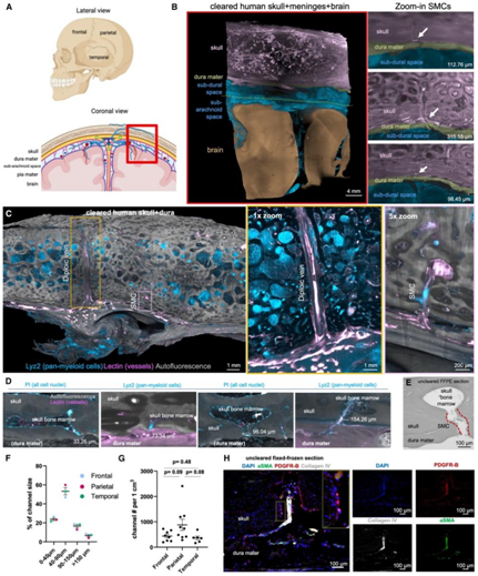 (A) 颅骨的额叶、顶叶和颞叶区域以及描绘脑膜层和大脑的冠状视图。(B) 对应于 (A) 中红色框的透明组织的代表性光片显微镜图像。(C)人类头骨不同区域的 SMC 量化。(D) 具有代表性的不同大小的颅骨-脑膜-通道:~ 33、~ 73、~ 96和~ 154 μm。(E) 来自 1 μm 厚 FFPE 嵌入颅骨硬脑膜切片的人类 SMC 示例。(F) 额叶、顶叶和颞区通道大小百分比的量化。(G) 量化带注释的通道数。(H) 人类 SMC 示例,动脉从 8 μm 厚的固定冷冻颅骨硬脑膜切片穿过颅骨,标有 DAPI(蓝色)、aSMA(绿色)、PDGFR-B(红色)和 CollagenIV(灰色)。