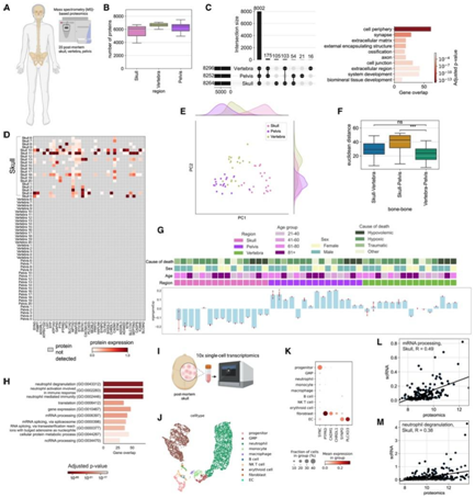 (A) 实验流程示意图,总共收集了 60 块骨头,对 20 块头骨、20 块椎骨和 20 块骨盆进行基于质谱的蛋白质组学分析。(B) 从每块骨头检测到的蛋白质数量用箱线图显示。(C) 从不同骨骼中检测到的常见蛋白质和独特蛋白质的数量以翻转图显示。(D) 属于与突触项相关的 GO分析的精选蛋白质的表达水平。(E) 所分析的三个骨骼的主成分分析。(F) 箱线图使用前 2 个主成分描述了骨骼对之间的欧几里德距离。(G) 骨骼中的 WGCNA 揭示了一个重要模块,其中与其他两块骨骼相比,颅盖基因下调。(H) 来自颅骨下调蛋白模块的 GO 分析。(I) 死后头骨样本的单细胞转录组分析图示。(J) UMAP可视化。(K) scRNA-seq 数据中检测到的独特头骨蛋白质的表达。(L) (G) 模块的相关图,mRNA 的GO分析。(M) (G) 模块的相关图,中性粒细胞脱颗粒的 GO 分析。