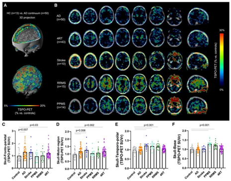 图6. 在患有炎症、缺血和退行性中枢神经系统疾病的患者的颅骨中观察到不同的 TSPO 信号。
