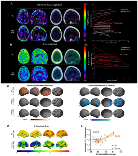 (A-B) 轴向和矢状切片显示A d患者和中风患者的PET 差异图像。(C) 表面投影显示 AD 患者、中风患者和健康对照者纵向 TSPO-PET 变化的统计参数映射 (SPM)。(D) 大脑表面投影显示颅骨中纵向 TSPO-PET 变化与 AD 患者和健康对照大脑中纵向 TSPO-PET 变化的区域相关性分析。(E) 左后扣带皮层中颅盖骨与大脑 TSPO-PET 变化之间的相关性分析。