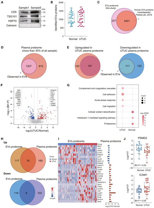 (A) 从血浆中分离出的 EV 的蛋白质印迹,用于常规鉴定的 EV 标记。(B) 箱线图显示正常和 UTUC EV 样本中鉴定的蛋白质。(C) 维恩图显示了本文中 EV 中鉴定的蛋白质,并且属于 Vesiclepedia 数据集中的人类 EV 蛋白质。(D) 维恩图显示了在 EV 中观察到的超过 30% 的 UTUC 血浆中鉴定出的蛋白质。(E) 维恩图显示在 EV 中观察到的 UTUC 血浆中蛋白质上调(左)或 UTUC 血浆中蛋白质下调(右)。(F) 火山图显示 UTUC 和正常血浆样本之间 EV 蛋白丰度差异。(G) 气泡图显示正常和 UTUC 样本中富集的通路。(H) 在 EV 和血浆中鉴定的上调或下调蛋白质的维恩图。(I) 正常样本和 UTUC 样本之间 EV 蛋白丰度差异的热图。(J) 箱线图显示 PSMD2和 ICAM1的 EV 蛋白丰度。