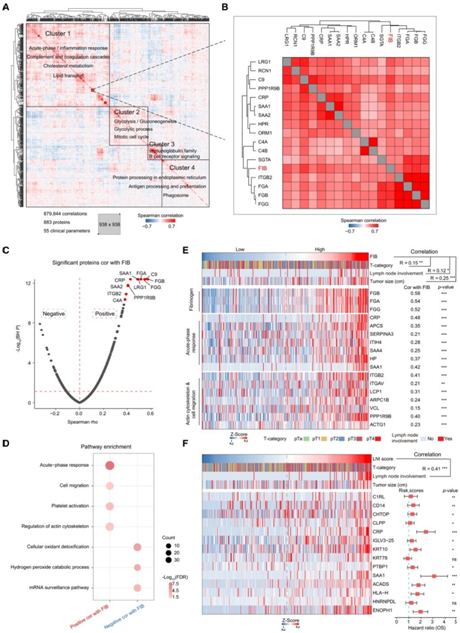 (A) UTUC 血浆发现队列的蛋白质和临床变量的成对Spearman 相关性,产生相关系数矩阵,其中每个变量与所有其他变量进行比较。(B) 放大区域突出显示纤维蛋白原 (FIB)(红色)和 16 种蛋白质,使用血浆蛋白质组分析(黑色)进行定量。(C) 火山图显示血浆 FIB 和蛋白质丰度之间的相关性。(D) 蛋白质富集的通路与 FIB 显著正相关或负相关。(E) 血浆 FIB 水平和蛋白质丰度的热图与 FIB 显著正相关。(F)(左)淋巴结受累 (LNI) 评分热图以及与 LNI 高度正相关的 14 种蛋白质的丰度。
