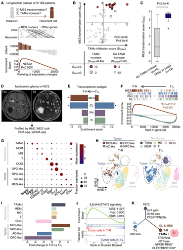 (A) 纵向 GB 患者间充质 (MES) 转化过程的特征。(B) 复发期间 MES 转化和 TAMo 浸润之间的相关性(上图)以及每个类别的患者数量(下图)。(C) TAMo 浸润增加的患者与 TAMo 未增加的患者的 MES 转化评分的比较。(D) 多中心胶质瘤患者 P673 手术前的 MRI。标记患者右脑肿瘤(TR)和左脑肿瘤(TL)的位置。(E) 从患者 P673 的 TR(左)和 TL(右)样本的批量 RNA-seq 数据推断出四种神经胶质瘤转录组亚型的富集分数。(F) 基于 TR 和 TL 之间基因表达等级变化分析四种转录组亚型的变化。(G) 在患者 P673 的 scRNA-seq 数据中识别出的不同肿瘤和非肿瘤聚类的代表性标志物。(H) 从患者 P673 的 TR 和 TL 样本的 scRNA-seq 中鉴定出的细胞的 t-SNE 图。(I) TR 与 TL 中每种细胞类型分数的倍数变化。(J) TR 与 TL 肿瘤细胞中 JAK/STAT3 信号通路的基因集富集分析 (GSEA) 分析。(K) 患者 P673 中 TL 和 TR 肿瘤的演变。