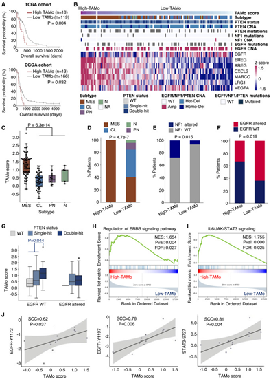 (A) TCGA(上)和中国胶质瘤基因组图谱 (CGGA)(下)队列中 IDH 野生型 GB 患者的 TAMo 评分与总生存率之间的关联。(B) TCGA 队列中 IDH 野生型 GBM 样本中 TAMo 标记和EGFR基因表达的热图。(C) 不同转录组亚型患者的 TAMo 评分比较。(D–F)高 TAMo 组与低 TAMo 组中不同转录组亚型 (D)、 NF1 (E) 和EGFR改变状态 (F)的患者比例的比较。(G) 具有不同 PTEN 突变状态的 EGFR 野生型和 EGFR 改变患者的 TAMo 评分比较。(H-I) 高 TAMo 组与低 TAMo 组 GBM 患者之间 ERBB 信号通路 (H) 和 JAK/STAT3 信号通路 (I) 的基因集富集分析。(J) CPTAC 数据集中 IDH 野生型 EGFR 野生型 GB 患者磷酸化 EGFR、磷酸化 STAT3 和 TAMo 评分之间的 Spearman 相关性分析。
