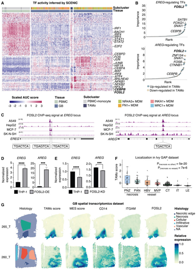 图5. TF活性分析揭示FOSL2作为TAMo的调节因子。(A) SCENIC 推断的 TF 活动热图。(B) 可能调节EREG(上)和AREG表达(下)的所有 TF 的特征重要性得分的排名。(C) 位于 EREG(左)和 AREG(右)基因附近的 FOSL2 结合峰和基序。(D-E)通过RT-PCR定量FOSL2过表达(OE)(D)和敲低(KD)(E)情况下THP-1单核细胞系中EREG和AREG的表达水平。(F) IvyGBM 数据集中不同解剖区域的 TAMo 评分箱线图。(G) 两名 IDH 野生型 GB 患者中不同组织学区域的 Mono/Macro 标记物(CD14、ITGAM)、FOSL2、TAMo 评分和间充质评分的空间分布。