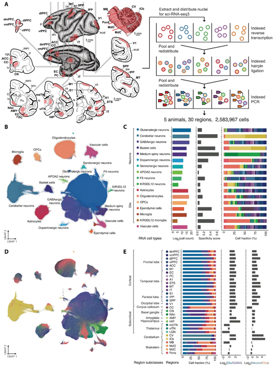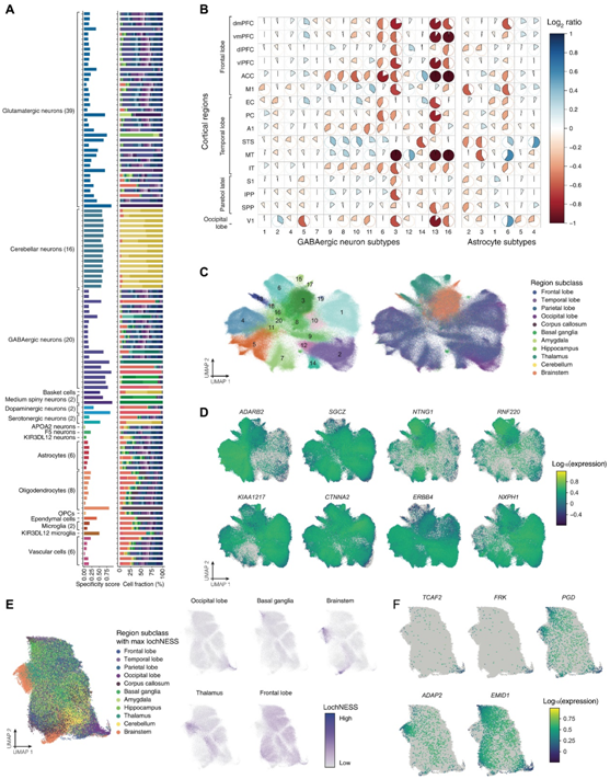研究者团队从皮质、皮质下、小脑和脑干的30个不同区域生成了单细胞核转录组分析 (snRNA-seq)数据,并使用三水平单细胞组合索引转录组分析 (sci-RNA-seq3)(图1A),确定了17种分子上不同的细胞类型,称为“细胞类型”(图1B-C),分别注释为:(i)神经元细胞,包括皮质谷氨酸能神经元(CAMK2A)、皮质GABA能神经元(GAD1和GAD2)、篮子细胞(GRID2和SORCS3)、其他小脑神经元(主要是颗粒细胞;GRM4)、中等棘神经元(DACH1、PPP1R1B和BCL11B)、血清素能神经元(TPH2)、多巴胺能神经元(TH和DBH);(ii) 非神经元细胞,包括小胶质细胞(DOCK2)、少突胶质细胞前体细胞(OPC和VCAN)、星形胶质细胞 (ALDH1A1和GFAP)、少突胶质细胞 (MOG和MBP)、血管细胞 (CFH) 和室管膜细胞 (FOXJ1) 。同时还捕获了4种稀有的细胞群(尚未在其它研究中发现):三个RBFOX3 + (NeuN +) 神经元样群(标记基因:APOA2、F5、KIR2DL1/2)和一个RBFOX3-小胶质细胞样群体(标记基因:KIR3DL1/2+和P2RY12+/PTPRC+/ENTPD1+)。