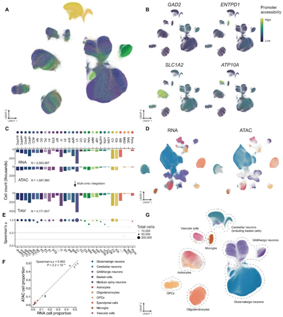 (A) 所有 snATAC-seq 细胞的 UMAP 可视化。(B) 细胞标记物启动子可及性评分。(C) 条形图显示 snRNA-seq、snATAC-seq 和集成数据集的大脑区域的细胞核计数。(D) 集成多模态数据的 UMAP 可视化。(E) Spearman 等级相关系数分析。(F) 散点图显示整个 snRNA-seq 和 snATAC-seq 数据集中的细胞类别比例之间的相关性。(G) 在 (A) 中所示的相同 snATAC-seq UMAP 可视化上可视化的集成衍生细胞类注释。