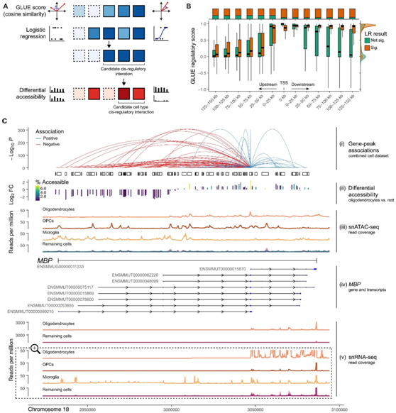 图5. 猕猴大脑图谱中顺式调节相互作用的景观。(A) 概述 cCRE 识别标准的示意图。(B) 根据峰和基因 TSS 之间的最小符号距离划分的基因峰 GLUE 调节分数的分布。(C) 候选调控元件从上到下显示为连接峰与MBP表达的推断调控链接的强度和方向。
