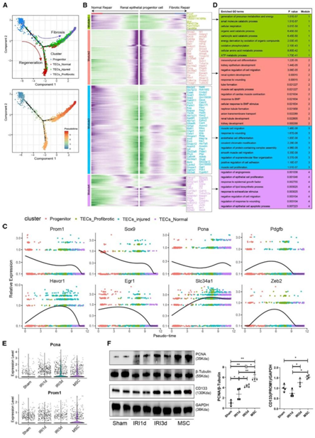 (A)轨迹分析揭示的潜在肾干/祖上皮细胞分化途径。(B)热图显示了沿肾干/祖细胞轨迹的两个分支动态基因的表达。(C)轨迹分析显示代表性干细胞和纤维化基因的动态表达。(D)GO分析。(E)假手术、IRI-AKI和MSC处理肾脏中Pcna和Prom1 (Cd133)的mRNA水平。(F)假手术、IRI-AKI和MSC处理的肾脏中中PCNA和CD133的Western blotting和半定量分析。