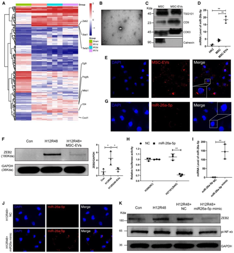 (A)热图显示假手术、IRI-1d、IRI-3d和IRI-7d中促纤维化和炎症标志物的表达。(B)电镜表征MSC-EV。(C) Western blotting 表征MSC-EV。(D) PCR检测HK2细胞、MSC和MSC-EV中miRNA-26a-5p的表达。(E)Dil标记的细胞外囊泡(红色)由HK2细胞内化。(F) Western blotting 分析。(G)在MSC-EV处理的HK2细胞中检测内化Cy3-miR-26a-5p(红色)。(H)在293T细胞中共转染miR-26a-5p或阴性对照(NC)与Zeb2 30 UTR报告基因(H27161)或对照报告基因(H306)后的荧光素酶报告基因检测结果。(I)通过PCR检测miR-26a-5p mimic在HK2细胞中的转染效率。(J)在HK2细胞中检测转染cy3标记的miR-26a-5p模拟物(红色)。(K) Western blotting显示HK2细胞H/R +/-外源性miR-26a-5p处理后ZEB2和pi-NF-kB蛋白水平。