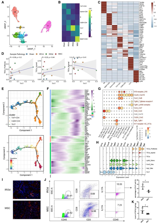 (A)假手术、IRI-AKI和MSC处理的肾淋巴细胞亚聚类。(B)假手术、IRI-AKI和MSC处理组中各淋巴细胞亚型的相对贡献。(C)各淋巴细胞亚型中前7个差异表达基因的表达情况。(D) Spearman相关分析显示Th17细胞丰度与TEC亚型丰度之间的关系。(E)轨迹分析揭示的CD4 T细胞潜在分化途径。(F)热图显示沿着CD4 T细胞轨迹的动态基因的表达。(G)免疫细胞亚群和TEC亚群的相互作用分析显示显著的受体配体对。(H) TEC和免疫细胞亚群中配体受体对基因的表达。(I) IRI-AKI (d3)-和MSC处理小鼠肾切片中Th17细胞标记物IL17A(红色)的代表性免疫荧光染色。(J)流式细胞术图显示在IRI-3d和MSC处理的肾脏中CD45+CD3+CD8-IL17A+Th17细胞的频率。(K)用ELISA测定的经IRI-3 d和MSC处理的肾脏中TGF-β1水平。
