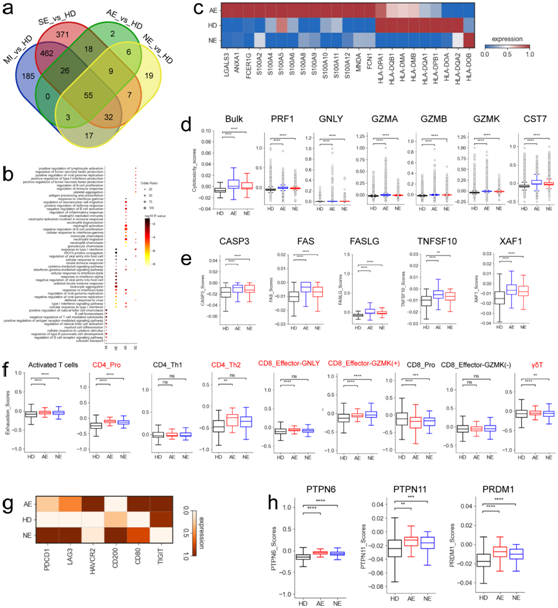 (a) 维恩图显示了T细胞中deg上调的数量。 (b) GO分析。 (c) 热图显示了不同组间T细胞中选定的中性粒细胞活化相关基因和HLA-II基因的标准化表达。(d) 箱形图显示了细胞毒性评分(左)和不同组(HD、AE和NE)T细胞中表达的细胞毒性相关基因。(e) 箱形图显示了不同组(HD、AE和NE) T细胞中凋亡相关基因的表达。(f) 箱形图显示了不同组(HD、AE和NE)效应T细胞的衰竭评分。(g) 热图描绘了不同组(HD、AE和NE)T细胞中标准化的衰竭相关基因表达。 (h) 箱形图描绘了不同组(HD、AE和NE)T细胞中表达的选定基因。