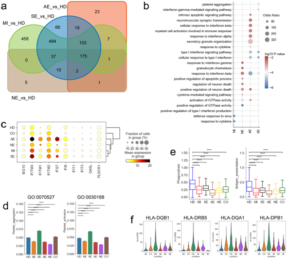 (a) 维恩图显示了骨髓细胞中上调的 DEG 数量。 (b) GO分析。(c) 组间骨髓细胞中选定的 IFN 反应基因的点图。(d) 巨核细胞中两个 GO 基因集[血小板聚集 (GO:0070527) 和血小板_激活 (GO:0042113)]标准化表达评分的条形图。(e) DC 中吞噬作用评分和抗原呈递评分的箱线图。(f) 来自不同 COVID-19 群体的 DC 中代表性 HLA-II 基因的小提琴图。
