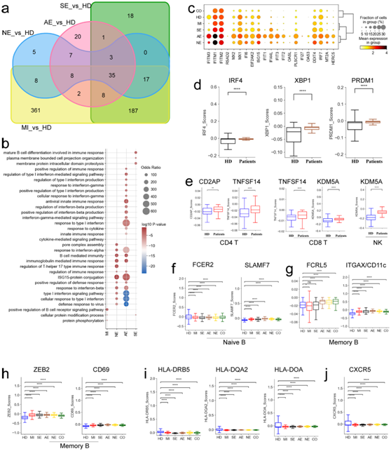 (a) 维恩图显示了 B 细胞中上调的 DEG 数量。 (b)GO分析。 (c) 组间 B 细胞中选定的 IFN 反应基因的点图。(d) COVID-19 患者和健康供体之间 B 细胞中选定基因的箱线图。 (e) COVID-19患者与健康供者之间CD4(左)、CD8(中)和NK(右)细胞中选定基因的箱形图。 (f) 箱线图显示了不同组的幼稚B 细胞中选定基因的表达。 (g) 箱线图显示了不同组的记忆 B 细胞中表达的选定基因。 (h) 箱线图显示了不同组的记忆 B 细胞中的ZEB2和CD69基因表达。(i) 箱线图显示了不同组 B 细胞中HLA-II基因的表达。(j) 箱线图显示了来自不同组的 B 细胞中的 CXCR5 表达。