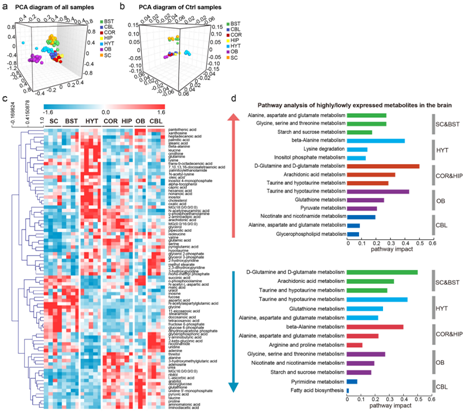 (a) 自由进食或STF小鼠脑代谢组PCA三维图。 (b) 自由进食的小鼠大脑代谢组的PCA三维图。 (c) 自由进食的小鼠七个脑区差异表达代谢物的热图。(d) 不同脑区高表达和低表达代谢物的通路分析。