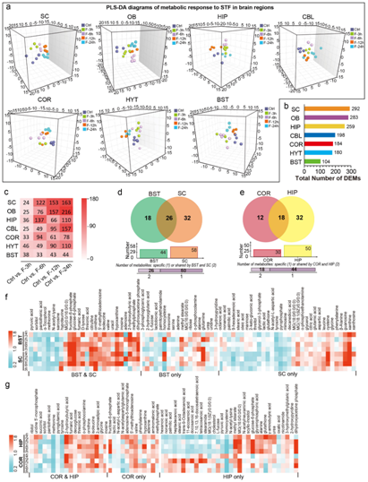 (a) SC中不同时期STF代谢反应的PLS-DA三维图。 (b) 七个脑区 STF 上的 DEM 数量。(c) 7个脑区在STF不同时段后的DEM数量。(d-e) 维恩图显示DEM 数量的。(f-g) DEM 热图。