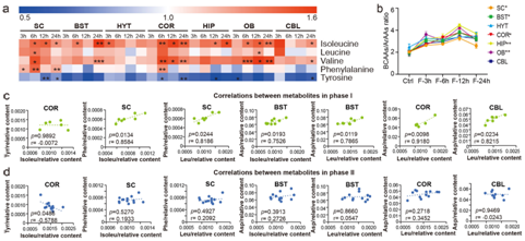 (a) 不同禁食时间后七个大脑区域的 BCAA 和 ArAA 水平热图。(b) STF 后七个脑区 BCAA/ArAA 比率的变化。 (c) I 期代谢物之间的相关性。(d) II 期代谢物之间的相关性。