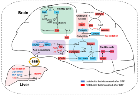 STF 诱导脂质和氨基酸代谢的整体重塑,特别是在 BCAA、ArAA、神经递质、蛋氨酸和瓜氨酸-NO 循环方面,以促进大脑在有限营养条件下的适应性反应。与大脑相反,STF 诱导肝脏能量代谢的显著重塑。在禁食状态下,肝脏中发现 FA 氧化增强,糖酵解和 TCA 循环下降(图7)。