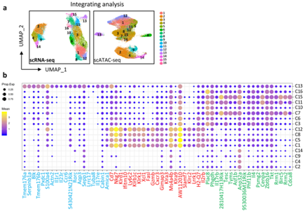 (a) UMAP图显示了对分选的 ST0–3 iNKT 细胞的 scRNA-seq 和 scATAC-seq 的综合分析。(b) 气泡图显示聚集的iNKT 细胞的各个聚类(C1–C16) 中的基因表达。