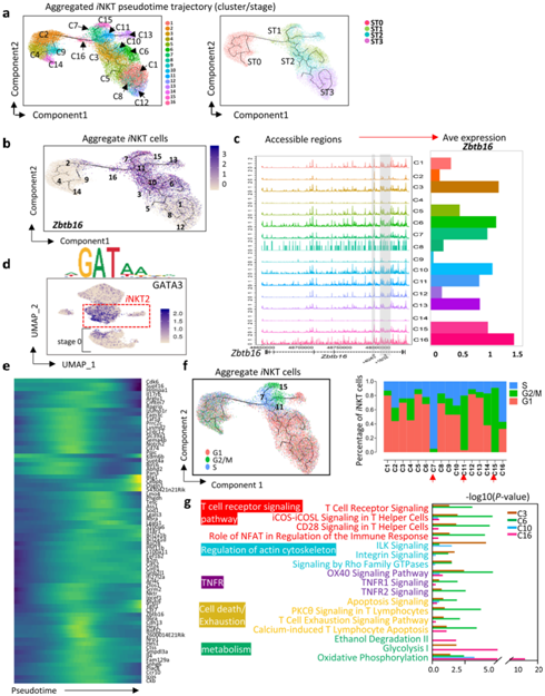 (a) 在 Monocle 3 定义的状态空间中,iNKT 细胞沿伪时间排序。 (b) 特征图描绘了Zbtb16在iNKT细胞发育中的单细胞基因表达轨迹。(c) 聚合 scATAC-seq 浏览器跟踪iNKT细胞聚类的Zbtb16(左)。条形图代表iNKT 细胞聚类中的Zbtb16平均 (Ave) 表达(右)。(d) 由GATA-3结合基序的活性着色的UMAP投影。 (e) 热图显示了从 scRNA-seq 数据的iNKT2 聚类C3、C6、C10 和 C16中选择的大多数 DEG 的伪时间排序。(f) 特征图描绘了聚集iNKT细胞发育过程中G1、G2/M和S期的单细胞基因表达轨迹(左)。柱状图表示G1、G2/M和S细胞在iNKT细胞聚类中的比例(右)。 (g) 聚类 C3、C6、C10 和 C16 中的 DEG。