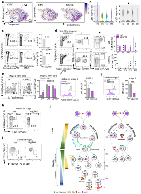 (a) 特征图描绘了ST0 i NKT 细胞发育过程中Cbfβ、Egr2和Slamf6的单细胞基因表达轨迹。 (b) iNKT 细胞不同阶段的Cbfβ表达以及ST0 i NKT 细胞不同聚类(C2、C9、C4 和 C14)中Cbfβ表达的小提琴图。(c) 来自Cbfβ KO 和 WT 小鼠的iNKT 细胞的代表性流动图(左)。(d) Cbfβ KO 和 WT 小鼠i NKT(富集抗 CD1d 四聚体后)不同阶段的代表性流程图(左)。条形图代表Cbfβ KO 和 WT 对照中iNKT 细胞频率和iNKT 细胞数量的平均值±SD(右)。 (e) 来自Cbfβ KO 和 WT 对照的 ST0 iNKT 细胞中 CD8 和 CD4 表达的代表性流程图(左)。条形图代表 DP、DN 和 CD4 SP ± SD 的平均值 ± SD(右)。 (f-g) 直方图显示Cbfβ KO和WT小鼠ST1 iNKT细胞中PLZF表达和Ki-67表达。 (h) Cbfβ KO和WT小鼠ST1 iNKT细胞PLZF与T-bet表达的代表性流动图。 (i) Cbfβ KO和WT小鼠ST2 iNKT细胞PLZF与RORγt表达的代表性流动图。(j) 小鼠iNKT细胞发育轨迹示意图模型(左)和Cbfβ在iNKT细胞发育中的作用(右)。