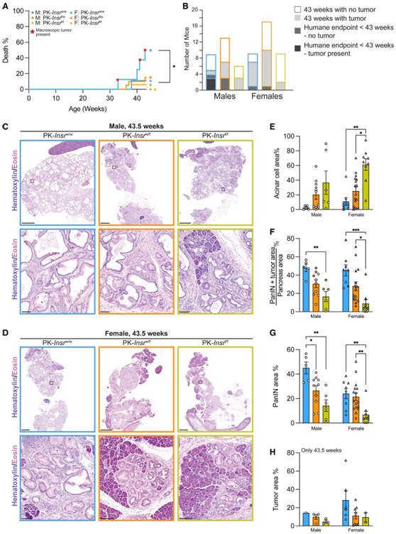 为了测试Insr缺失是否影响 Kras G12D介导的腺泡细胞 PDAC 形成,他们检测了一组 5-16 只 PK- Insr w/w、PK- Insr w/f和 PK- Insr f/f小鼠。一半的雄性 PK- Insr w/w小鼠和一些雌性 PK- Insr w/ w小鼠较早死亡(图2A)。因此,他们选择在 Kras G12D小鼠43.5 周龄时结束研究。他们发现4只雄性pk-insrw /w小鼠中存在胰腺导管腺癌(PDAC),但更重要的是,雄性pk-insrw/w小鼠的几乎整个实质都由囊肿、PanIN和ADM组成的导管化生所取代(图2A-E)。三只雄性 PK-Insr w/f小鼠在 43.5 周之前死亡,没有肉眼可见的肿瘤(图2A-B),但该基因型的更多动物保留了正常的腺泡细胞区域(图2C-E)。没有雄性 PK-Insr f/f小鼠在 43.5 周龄前死亡(图 2A-B),并且它们平均保留了更多正常的腺泡细胞面积(图 2C-E)。一只雌性 PK-Insr w/w小鼠以及一只雌性 PK- Insr w/f小鼠在 43.5 周龄之前死亡,而没有雌性 PK-Insr f/f小鼠在 43.5 周龄时死亡(图2A-B)。尸检时未发现肉眼可见的肿瘤(图2A-B),但从组织学角度来看,发现雌性中 PDAC 的发生率呈Insr剂量依赖性(图2B-D)。每种基因型的大多数雌性小鼠都保留了一些正常的实质组织(图2D-E)。