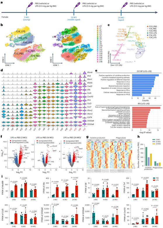 (a) LPS和PBS的实验方案以及scRNA-seq和bulk RNA-seq的时间点。(b) scRNA-seq 的 tSNE 图显示幼年 (3 MO)、中年 (14 MO) 和老年 (24 MO) 小胶质细胞对 LPS 刺激的不同反应。 (c) bulk RNA-seq 的 PCA 图显示幼年、中年和老年小胶质细胞对 LPS 刺激的不同反应。 (d) 小提琴图显示Ifitm1、Ifitm6、Ilr2、Il1β、Ifitm2、Ccl5、Ccl7、Ccl3、Ccl4、Ccl12、Ifi205和Il1rn的表达水平,这些基因在c13-c16中富集。(e) c13-c16富集基因中GO和IPA注释的前10个显著BP (BP: 生物过程)。(f) 3个月、14个月和24个月龄时LPS刺激的小胶质细胞与PBS处理的对照的火山图。(g) 3 个月、14 个月和 24 个月时,LPS 刺激的小胶质细胞与 PBS 处理的对照的细胞因子产生和吞噬作用相关 DEG 的热图。 (h) 条形图显示细胞因子产生相关和吞噬作用相关基因的 DEG 数量。 (i) Myd88、Il1b、Il6、Tnf、Ccl5、S100a8、S100a9和Cxcl13的 FPKM 。