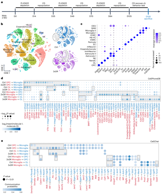 (a) 小胶质细胞转换模型方案及实验时间点。(b) tSNE图显示了3xDR小胶质细胞的衰老样表型。 (c) 点图显示所有 16 种细胞类型(18 个群体)中众所周知的代表性细胞类型富集标记基因的表达水平。 (d) CellPhoneDB 预测的显著配体-受体相互作用。(e) CellChat 预测的重要分子间相互作用。