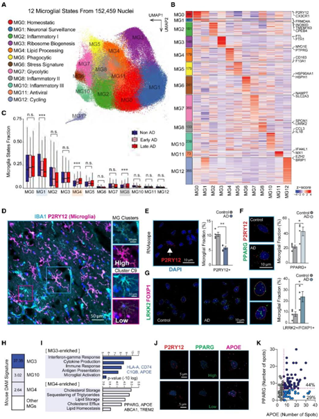 (A) 152459 个小胶质细胞核的 UMAP,并在 snRNA-seq 数据中注释了小胶质细胞状态。(B) 热图显示 12 个小胶质细胞状态下的 2228 个高表达基因。(C) AD 病理组中的细胞分数分布。(D)免疫染色。(E) 死后前额皮质组织的 RNAscope原位杂交。(F) P2RY12 +的小胶质细胞部分与共同检测的 MG4 标记PPARG。(G) P2RY12 +的小胶质细胞部分与共同检测的 MG2 标记物LRRK2和FOXP1。(E-G) 8 位受试者的量化结果。(H) 跨人类小胶质细胞状态的小鼠 DAM 特征的富集分析。(I)GO分析。(J) 使用 RNAscope 对 4 名 AD 受试者的P2RY12 +小胶质细胞中的PPARG和APOE进行联合检测分析。(K)大于 7 个点的APOE和PPARG检测揭示了离散的APOE+细胞群体。