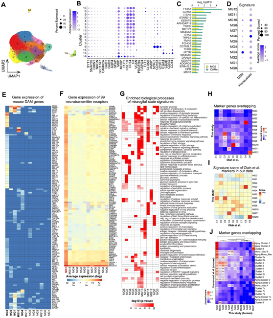 (A) 174420 个来自人类死后脑组织的计算机分选免疫核的UMAP,在 snRNA-seq 数据中标记为 16 个聚类。(B) 脑细胞类型和免疫细胞类型的典型标记物的表达模式。(C) 23 个 MG5 和 C9 共享标记基因的 log2foldchange 的平均值。(D) 点图显示每个小胶质细胞转录状态下 DAM 和稳态基因的特征得分。(E) 热图显示每个小胶质细胞状态中 DAM 基因的表达。(F) 12 个小胶质细胞状态中神经递质受体的表达水平。(G) GO分析。(H) 热图显示标记基因的显著重叠。(I) 热图显示标记基因的特征得分。(J) 热图显示标记基因的显著重叠。