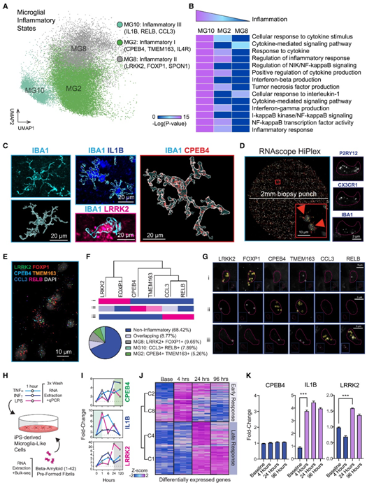 (A) 小胶质细胞三种炎症状态的 UMAP。(B) 三种炎症状态下炎症相关通路的富集。(C) 炎症状态标志物的多重免疫染色。(D) RNAscope 分析。(E) 具有炎症状态探针检测的复合图像的更高放大倍数。(F)对 4 名 AD 受试者的 291 个小胶质细胞进行细胞分数分析。(G) 来自代表性小胶质细胞核的图像,具有离散炎症状态的特征。(H–J) iPSC 衍生的小胶质细胞样细胞 (iMGL) 中炎症状态标志物的转录动力学。(I) 用 TNFα (40 ng/mL)、INFγ (30 ng/mL) 或 LPS (10 ng/mL) 处理 1 小时,并通过 qPCR 进行分析。(J) 用预先形成的β淀粉样蛋白 (1-42) 原纤维进行处理并通过 RNA-seq 进行分析;早期和晚期反应上调基因的热图。(K)响应淀粉样蛋白处理的CPEB4、IL1B和LRRK2表达水平。
