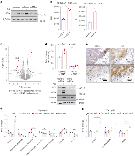 (a) 与原代人脂肪细胞(Adi)共培养指定时间的 SKOV3ip1 细胞中 HIF1α 的免疫印迹。(b) 荧光素酶活性检测。(c) 火山图显示受脂肪细胞诱导的 HIF1α 表达调节的蛋白质。(d) 脂肪细胞共培养 16 小时后 SKOV3ip1 HIF1α 敲低细胞中 HIF1α 和 HK2 的 qPCR(上)和免疫印迹(下)。(e) 使用来自高级别浆液性 OvCa 患者的人网膜肿瘤的连续切片对 HIF1α 和 HK2 进行免疫组织化学分析。(f-g) 代谢组学分析,条形图显示糖酵解途径和 TCA 循环代谢物的差异倍数。