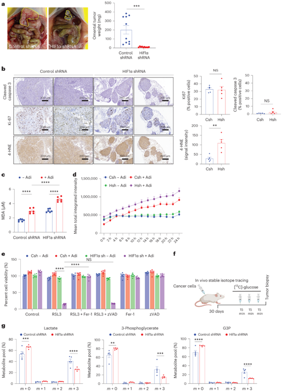(a) 左:腹膜内注射 SKOV3ip1 HIF1α shRNA 细胞,肿瘤负荷显示为左侧为 sh control,右侧为 shHIF1α。右:肿瘤负荷测量为网膜转移重量。 (b) 连续切片中的裂解半胱天冬酶3、Ki-67和4-HNE染色。 (c) 脂质过氧化:对照细胞和HIF1α敲低细胞与脂肪细胞共培养18小时,并测定细胞内MDA水平。(d-e) 量化脂质 ROS 的产生,并进行MTT测定以确定用所示小分子化合物处理后癌细胞的活力。(f) HIF1α 敲低癌细胞的荷瘤小鼠中的稳定同位素示踪。(g) [13C]-葡萄糖衍生的G3P和糖酵解中间体的标记。