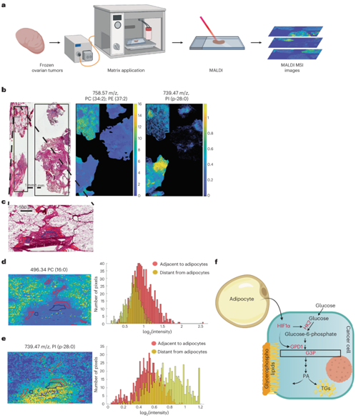 (a) 卵巢高级浆液性肿瘤样本的 IMS 分析示意图。(b-e) 冰冻大网膜肿瘤切片的组织学和 MALDI IMS 分析。(f) 脂肪细胞-OvCa 细胞相互作用导致 OvCa 细胞中葡萄糖利用率改变的图示。