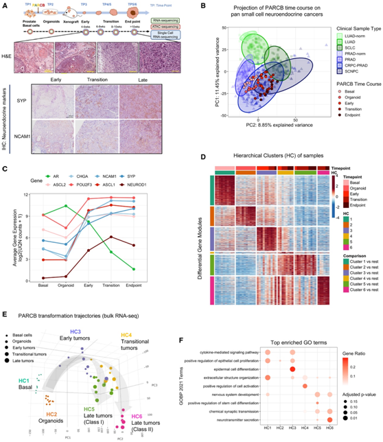 (A) PARCB 时程研究的示意图以及组织微阵列中连续肿瘤的神经内分泌标记物(SYP 和 NCAM1)的代表性苏木精和伊红 (H&E) 染色和免疫组织化学 (IHC) 染色。使用bulk RNA-seq(绿色圆圈)、bulk ATAC-seq(红色圆圈)和scRNA-seq(蓝色圆圈,仅肿瘤)对时间点 (TP1-6) 样本进行分析。(B) 将 PARCB 时程样本投影到由泛癌临床肿瘤数据集定义的 PCA 框架上。(C) 所选 SCNPC 相关蛋白和标记的平均基因表达。(D) 样品层次聚类 (HC) 的热图(列)和相应差异上调的基因模块(行)。(E) PARCB 时程样本和转分化轨迹(包括初级弧和次级分叉)的 PCA。(F)GO分析。