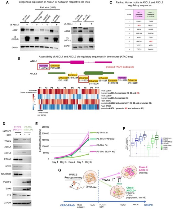 (A) 免疫印迹分析。(B) ASCL1 和 ASCL2 的假定顺式调控元件 (CRE) 示意图(上)以及使用 PARCB 时程 ATAC 测序的 ASCL1 和 ASCL2 CRE 的开放染色质可及性热图(下)。(C) ASCL1 启动子和 ASCL2 增强子区域中排名前 8 的转录因子基序分析。(D)免疫印迹分析。(E) 使用强力霉素诱导敲除 TFAP4 的 P7-TP6 (ASCL1+) 和 P3-TP5 (ASCL2+) 细胞系的细胞增殖分析。(F) 前列腺癌和肺癌数据集中的 TFAP4 表达。(G) PARCB 时间过程研究的概要。