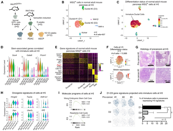 (A)表达致癌Myc的胰腺细胞scRNA-seq。(B) UMAP图显示正常胰腺表达msi2的聚类。(C)由CytoTRACE分析生成的UMAP图预测正常胰腺导管细胞聚类的分化状态。(D)在表达msi2的胰腺细胞聚类中显著的干细胞相关基因的表达。(E)热图显示胰腺中每个msi2表达聚类中富集的前10个基因。(F) UMAP图显示,通过CytoTRACE预测的大多数未分化群体(上),通过Hmmr mRNA表达(下)在Msi2-Myc小鼠5周后的癌前细胞中鉴定(下)。(G) Msi2-Myc小鼠在他莫昔芬后5周的癌前病变的代表性图像。(H)癌基因和干细胞相关特征基因表达富集。(I) GSEA图显示未分化的癌前细胞中干细胞和细胞周期基因的富集。(J)宏基因分析。