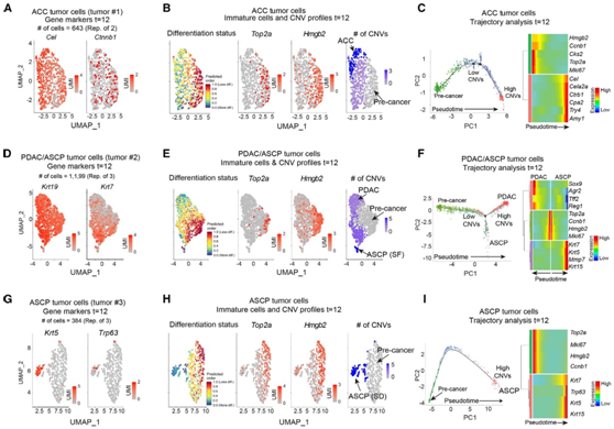(A) UMAP图显示典型ACC肿瘤中常见分类标记的表达。(B) UMAP图显示分化状态,未分化细胞(左,红色)与Hmg2b和Top2a表达高度一致(中)。CNV的上升(紫色,右)与ACC分化的增加平行。(C)显示ACC伪时间进展的轨迹图。(D) UMAP图显示典型PDAC/ASCP(SF)肿瘤中常见分类标记的表达。(E) UMAP图显示分化状态,未分化细胞(左,红色)与Hmg2b和Top2a表达高度一致(中)。CNV的上升(右)与终末期PDAC/ASCP(SF)肿瘤分化的增加平行。(F) PDAC/ASCP(SF)肿瘤轨迹图(左);ASCP(SF)进展过程中基因表达谱变化的热图(右)。(G)代表性的UMAP图,显示了代表性ASCP中常见分类标记的表达。(H) UMAP图显示分化状态,未分化细胞(左)与Hmg2b和Top2a表达高度一致(中)。CNV的增加(右)与ASCP分化的增加相一致。(I) ASCP(SD)肿瘤轨迹图(左);ASCP进展过程中基因表达谱变化的热图(右)。