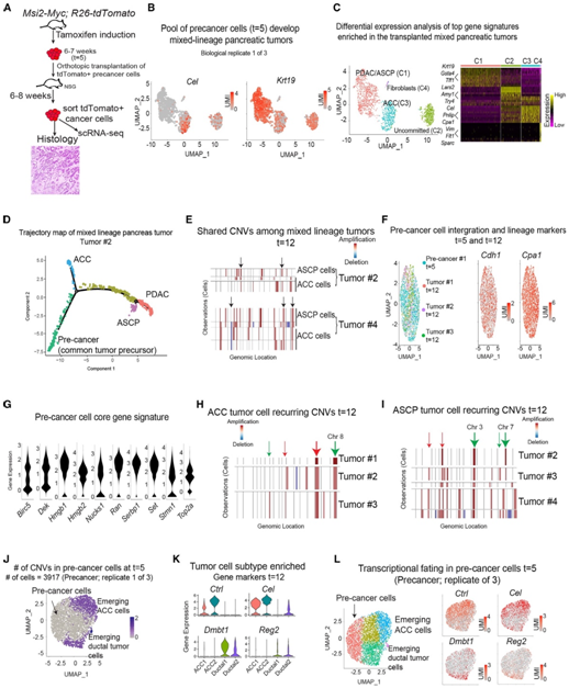 (A)表达致癌MYC的胰腺细胞scRNA-seq图。(B)细胞(ACC标记物)和Krt19(导管标记物)的表达表明混合谱系胰腺癌的特征。(C)差异表达分析,通过分类来突出已鉴定细胞群体的基因特征。(D)三系肿瘤伪时间进展轨迹图,显示ACC、PDAC和ASCP肿瘤细胞。(E)多谱系胰腺肿瘤的推断CNV分析显示,在两个独立样本中,不同命运 (ACC/ASCP) 之间有共同的CNV标记,表明有共同的起源。(F) scRNA-seq数据的整合显示了共享的不成熟细胞群(称为癌前细胞)。(G)癌前细胞(常见肿瘤前体)核心基因随时间的特征。(H)高度保守和不保守的小鼠ACC肿瘤。(I)高度保守和不保守的独立小鼠ASCP/鳞状肿瘤。(J) UMAP图显示有代表性的早期癌前病变中出现不同的CNV印迹。(K)在胰腺肿瘤亚型、ACC和ASCP中观察到富集的基因标记。(L) 癌前病变的UMAP图显示ACC和PDAC/ASCP的早期转录分化。