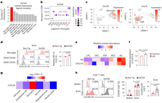 (a) 根据 5xFAD 小鼠的 scRNA-seq 数据中趋化因子配体-受体对的表达预测细胞间相互作用。 (b) 气泡图分别描绘了小胶质细胞和 CD8 + T 细胞之间排列的趋化因子配体-受体相互作用。(c) UMAP可视化。(d) CXCL16在10月龄Non-T和5xFAD小鼠的小胶质细胞(CD45int/+CD11b+)、非小胶质免疫细胞(CD45+CD11b-)和非免疫细胞(CD45- CD11b-)中的表达。(e) 不同神经退行性疾病个体中 Aβ 和 CXCL16 蛋白表达的热图。(f) AD 个体与健康个体中 CXCL16 蛋白的相对丰度。(g) 从人脑中分离出的跨细胞类型或全脑皮层的CXCL16表达。(h) 来自 10 个月大的 Non-T和 5xFAD小鼠脾脏和大脑的CD8+ T 细胞上的CXCR6 表达。