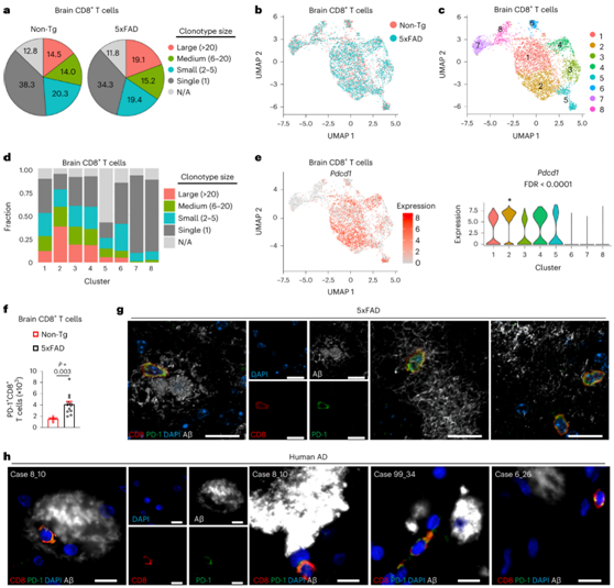 (a) 饼图总结了年龄匹配的Non-Tg 和 5xFAD 小鼠中大脑 CD8 + T 细胞克隆型大小的百分比。(b-c) 按基因型或亚群着色的脑 CD8+ T 细胞亚群的 UMAP 图。 (d) 条形图显示CD8 + T 细胞聚类的克隆型大小分布。 (e) 脑CD8+ T细胞中的Pdcd1表达。(f) 10月龄Non-Tg和5xFAD小鼠脑内PD-1+CD8+ T细胞的数量。 (g) 在12个月大的5xFAD小鼠中,三个独立的成像场描绘了共表达PD-1(绿色)并接近Aβ(白色)的脑CD8+ T细胞(红色)。(h) 四个独立的成像场描绘了共表达PD-1(绿色)并靠近Aβ(白色)的脑CD8+ T细胞(红色)。