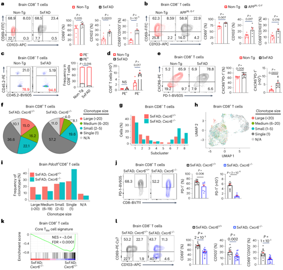 (a-b) 10月龄Non-Tg和5xFAD小鼠和9月龄Non-Tg和APPNL-G-F小鼠脑CD8+ T细胞中的CD69+、CD103+和CD69+CD103+细胞。(c-d) 10月龄Non-Tg和5xFAD小鼠大脑中PE+循环和PE-组织驻留CD8+ T细胞的频率和数量。(e) 10月龄Non-Tg和5xFAD小鼠脑CXCR6+PD-1+CD8+ T细胞。(f) 饼状图总结了脑CD8+ T细胞克隆型大小的百分比。(g) 每个聚类中脑CD8+ T细胞的频率。(h) 脑CD8+ T细胞的克隆型按大小着色。(i) Pdcd1+CD8+ T细胞克隆型大小的频率。(j)小鼠脑PD-1+CD8+ T细胞。(k) GSEA富集图。(l) 脑CD8+ T细胞中的CD69+、CD103+和CD69+CD103+细胞。